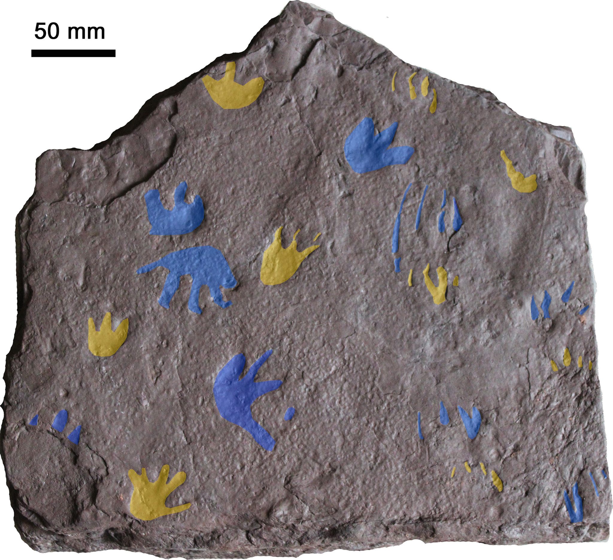 前脚(手)的足迹以黄色显示,后脚(脚)的足迹以蓝色显示。图片来源:Grzegorz Niedźwiedzk