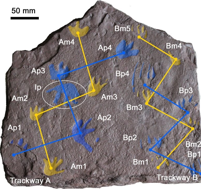 澳大利亚石板的完整标注图像,展示了对足迹的解读。前脚(manus)的足迹以黄色显示,后脚(pes)的足迹以蓝色显示。石板上有两条足迹,分别为A和B。每条足迹的编码如下:Am1至Am4分别表示“足迹A,手足足迹1”至“足迹A,手足足迹4”。Ap1等表示“足迹A,pes足迹1”等。Bm1-4和Bp1-4表示足迹B。连接足迹的蓝色和黄色锯齿线表示每条足迹中手足足迹和pes足迹的顺序。白色椭圆形旁边的标签“Ip”表示“单独的pes足迹”,即朝向与足迹相反方向的单个足迹。图片来源:Grzegorz Niedźwiedzk